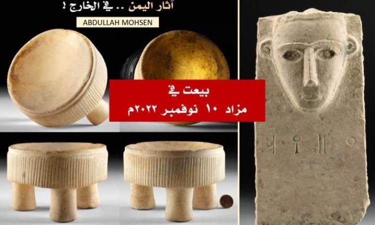 وقال محسن المتخصص في علم الأثار في منشور كتبه على”فيسبوك” إنه تم بيع شاهد جنائز من الحجر الجيري من آثار اليمن ، منحوت بدقة، برأس بارزة فوق نقش مسندي في معرض “ارتميس” للمزادات في الولايات المتحدة، الخميس الماضي.