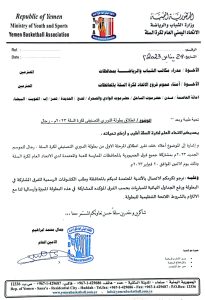 وجه الاتحاد العام لكرة السلة تعميماً لمدراء مكاتب الشباب والرياضة بالمحافظات وأمناء عموم فروع الاتحاد بأمانة العاصمة وعدن وحضرموت الساحل وحضرموت الوادي ولحج والحديدة وتعز وإب والمحويت والبيضاء بشأن موعد انطلاق المرحلة الأولى لبطولة الدوري التصنيفي لكرة السلة للرجال للموسم الجديد 2023 والذي سيقام بمشارك جميع فرق الجمهورية الممارسة للعبة والمعتمدة لدى الاتحاد.