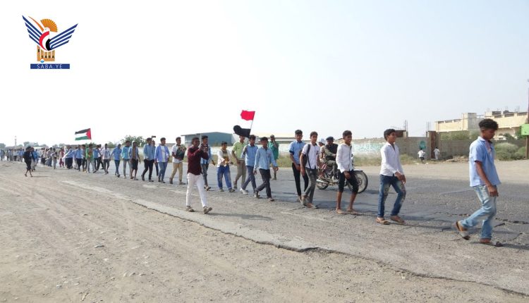 وفي السياق، نفذ 220 متخرجا من دورات طوفان الأقصى من طلاب مدارس مديرية الحجيلة مسيرًا على الاقدام، بمناسبة اختتام مشاركتهم في دورات التعبئة العامة المفتوحة.