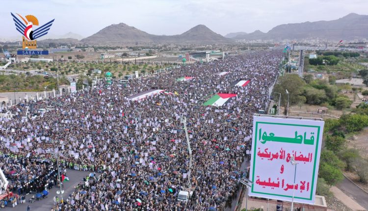 ورفعت الحشود المليونية في المسيرة، العلمين الفلسطيني واليمني، وشعارات الصرخة والجهاد والمقاومة، والمؤكدة على استمرار الصمود والثبات في مواجهة العدوان الأمريكي الصهيوني، وإسناد غزة حتى تحقيق النصر.