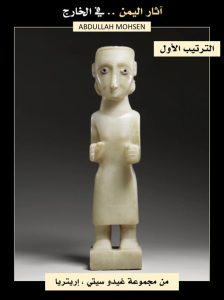 من مجموعة غيدو سيتي ، إريتريا ، تمثال لامرأة من قتبان، اليمن (ارتفاع 60 سنتيمتراً)، تقف على قاعدة مستطيلة عالية مع مد ساعديها ، يدها اليمنى مفتوحة ، بينما يدها اليسرى مشدودة ، ترتدي ثوبًا طويلًا ، ووجهها بيضاوي الشكل مع ذقن صغير مدور ، وشفتين ممتلئتين كأنهما وعدٌ بقبلة، وأنف طويل مستقيم ، وعينان مطعمتان بخطوط تجميلية بارزة. ، وحواجب مقوسة بدقة.