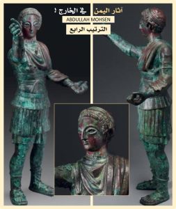 التمثال برونزي من فترة القرن الثالث فبل الميلاد إلى القرن الأول الميلادي، ارتفاعه (80 سم) ، يشبه في وقفته تمثال أثري يمني آخر موجود في دار الآثار الإسلامية ، الكويت.