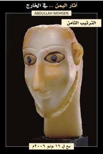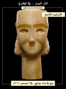 تمثال رأس رجل من اليمن، القرن الثالث قبل الميلاد ، القرن الأول الميلادي، مع ذقن بارزة ، وشفاه ممتلئة ، وشارب محفور رفيع ، وعيون مجوفة للترصيع ومحددة بالبرونز ، وحواجب مخددة ، وآذان مصقولة بشكل طبيعي، الارتفاع 18 سم، بيع في دار سوذبي للمزادات في 7 ديسمبر 2021م بـ 214 ألف جنيه إسترليني (٢٨٤,٨٨٦ دولار).