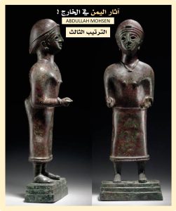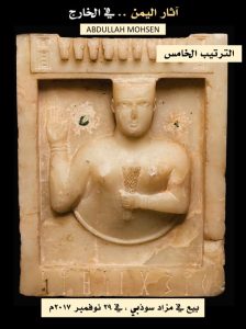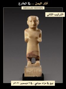 تمثال امرأة من اليمن، قتبان، القرن الثالث قبل الميلاد ، القرن الأول الميلادي. تقف مع ساعدين ممتدين، على قاعدة متكاملة مُدخلة في قاعدة منفصلة ، كل منها محفور في المقدمة بسطر واحد من الكتابة العربية الجنوبية (ل ب ا/ذ ت/ث ب و)، وترتدي سترة طويلة ضيقة ، والعينان مع حدقات مطعمة ، وحاجبان محفوران، وآذان مثقوبة، الارتفاع الإجمالي 46 سم، بيع في مزاد دار سوذبي ، في 7 ديسمبر 2021م بـ 499 ألف جنيه إسترليني (٦٦٣,٦٧٠ دولار)