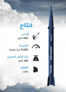 وبحسب موقع “آرمي تكنولوجي” -وهو من أبرز المواقع العالمية المتخصصة في تحليل وتوثيق المعلومات المتعلقة بالصناعات الدفاعية والتقنيات العسكرية- يعد صاروخ “فتّاح” من أهم الأسلحة المتطورة في ترسانة الحرس الثوري الإيراني بفضل سرعته الفرط صوتية التي تتراوح بين 13 و15 ماخا.