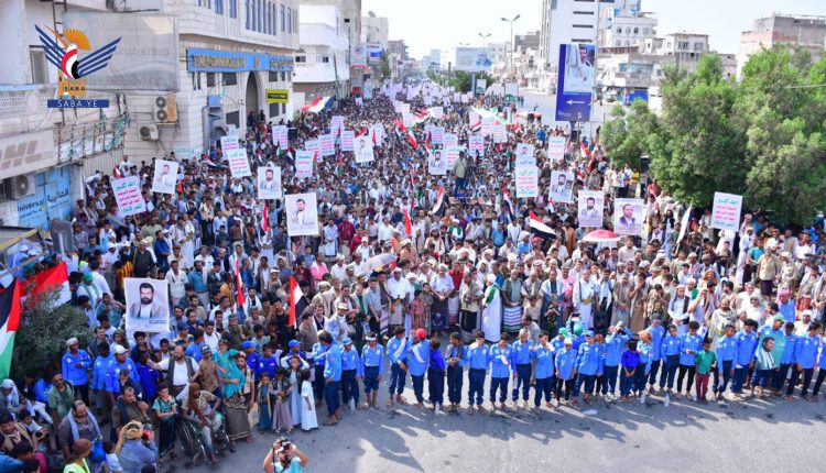 مسيرات جماهيرية بالحديدة تحت شعار “ثابتون مع غزة وإيران ضد الإجرام الصهيوأمريكي”