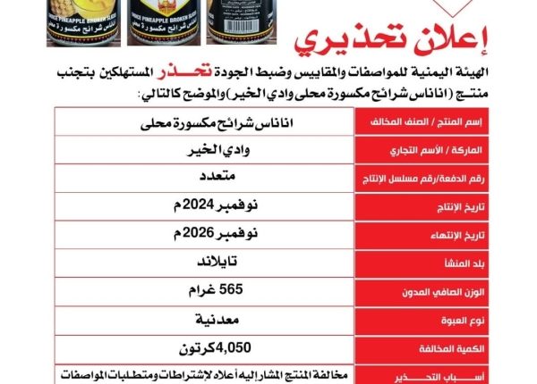 أصدرت الهيئة اليمنية للمواصفات والمقاييس وضبط الجودة، بصنعاء، تحذيراً للمستهلكين وأصحاب محلات البيع بعدم شراء أو بيع منتج أناناس شرائح مكسورة محلى ماركة وادي الخير- تايلندي الصنع.