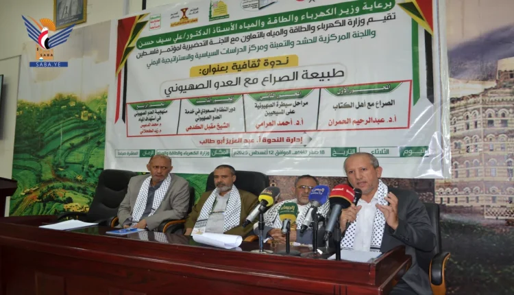 عُقدت اليوم بصنعاء، ندوة ثقافية بعنوان “طبيعة الصراع مع العدو الصهيوني”، نظمتها وزارة الكهرباء والطاقة والمياه، بالتعاون مع اللجنة التحضيرية لمؤتمر فلسطين.