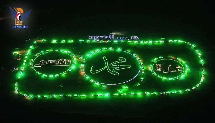 ورسم المسير الضوئي الذي تقدمه قائد قوات حرس الحدود اللواء بندر العمري وقيادة الألوية، لوحة ضوئية باسم الرسول الأعظم “محمد” صلوات الله وسلامه عليه وعلى آله، و”غزة تنتصر” بعد أن جاب شوارع مدينة صعدة وصولاً إلى ساحة المولد النبوي الشريف.