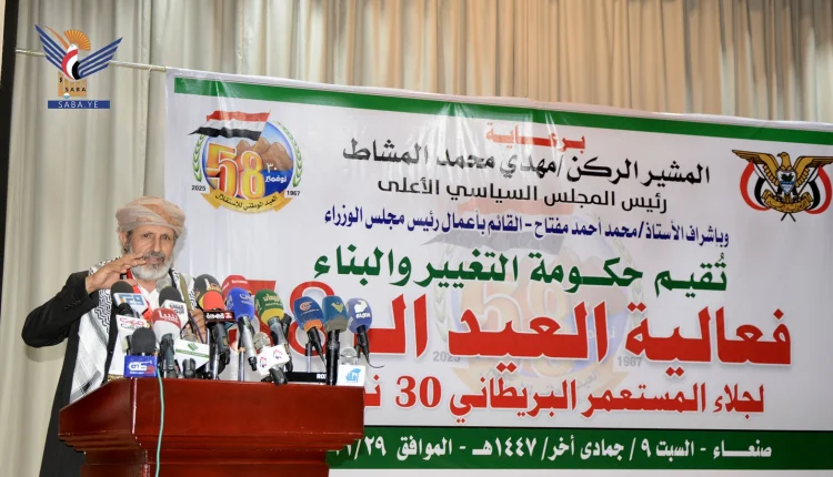 وأوضح أن احتفال الشعب اليمني بالذكرى الـ 58 للاستقلال، يأتي في ظل متغيرات إقليمية ودولية، تحتم على الجميع الاصطفاف والتلاحم لتجاوز التحديات الراهنة بما يحفظ للوطن وحدته وسيادته واستقلاله.. مشيرًا إلى أن جلاء آخر جندي بريطاني من جنوب اليمن، جاء بفضل تضحيات الثوار اليمنيين من أبطال سبتمبر وأكتوبر.
