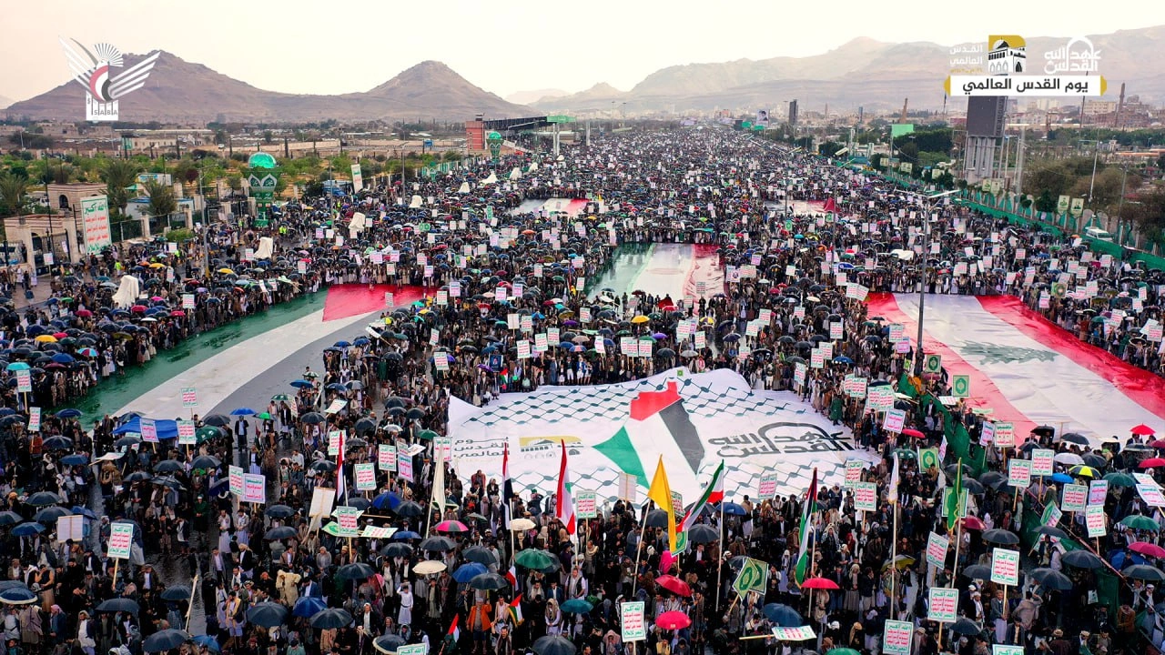 ورفعت الجماهير المحتشدة التي خرجت تحت زخات المطر، أعلام اليمن وفلسطين وايران ولبنان وشعارات المقاومة والبراءة من الأعداء، تجديداً للعهد والوفاء للقدس ونصرة للشعب الفلسطيني وقضيته العادلة حتى استعادة كامل أراضيه المغتصبة وإقامة دولته المستقلة وعاصمتها القدس الشريف.
