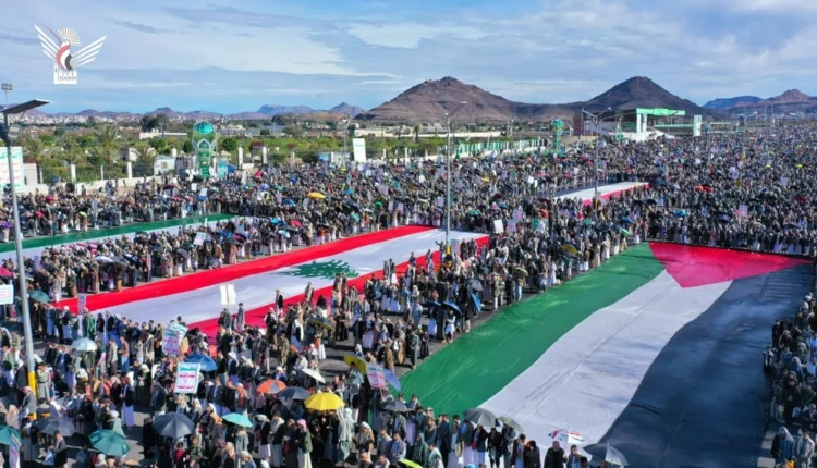 وجددت الحشود التي رفعت أعلام اليمن وفلسطين ولبنان وإيران، التأكيد على موقف اليمن الثابت والمبدئي في نصرة الشعب الفلسطيني وقضيته العالة، والتصدي للغطرسة الأمريكية والصهيونية التي تستهدف الأمة العربية والإسلامية.