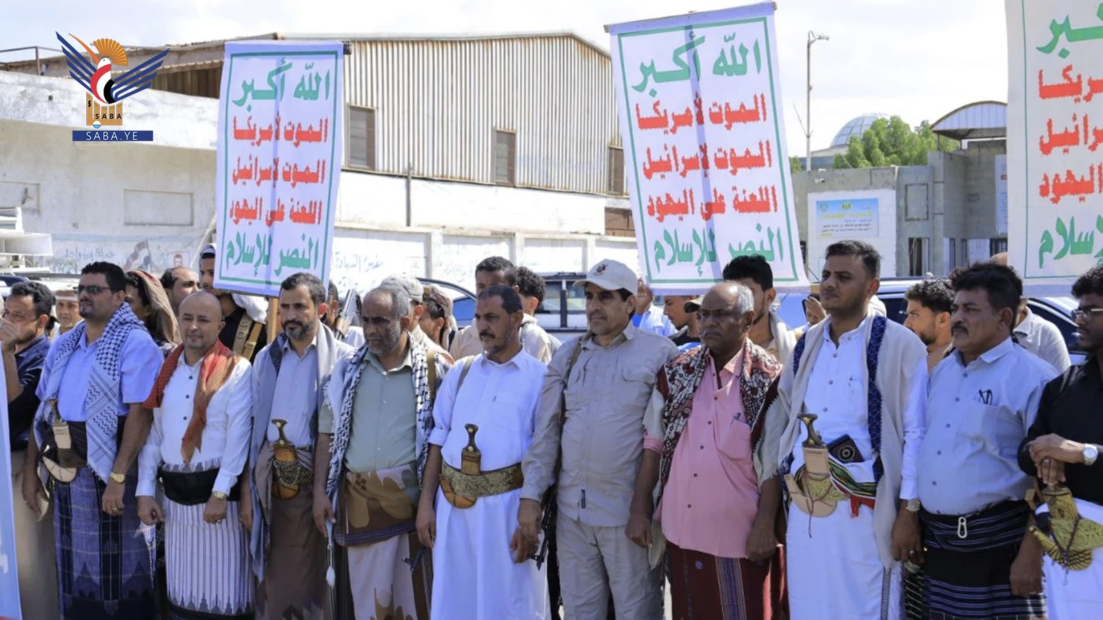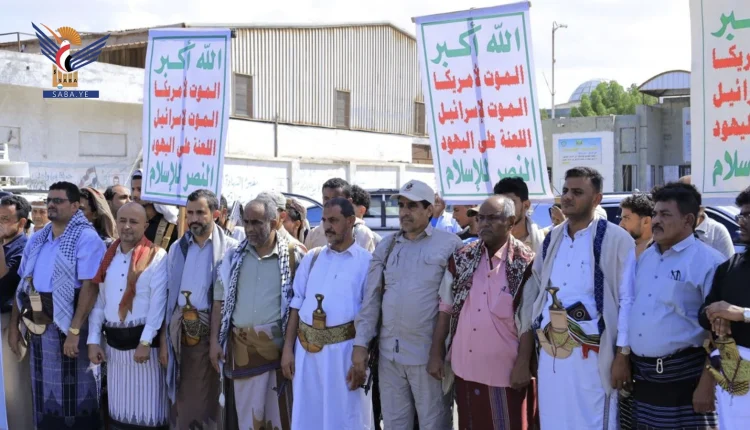 وفي الوقفة، أكد وكيل أول المحافظة أحمد البشري أن التلاحم بين صنعاء وطهران وبيروت وغزة والعراق قد حطم كافة رهانات الحرب النفسية وآلة التضليل الصهيونية.. مشيراً إلى أن وعي الشعب اليمني يمثل الصخرة التي تتحطم عليها كافة المؤامرات.