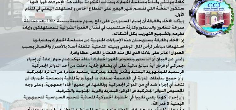 قال الاتحاد العام للغرف التجارية الصناعية اليمنية والغرفة التجارية الصناعية بأمانة العاصمة، أن ما تسمى “مكاتب الرقابة الجمركية” فرضت إجراءات غير قانونية وغير دستورية على القاطرات والشاحنات المحملة بالبضائع القادمة من بعض الموانيء والمنافذ البرية والبحرية للجمهورية اليمنية، بفرضها رسوماً جمركية جديدة بنسبة 100%.
