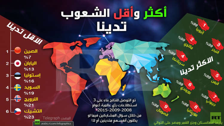 هل اليمن من أكثر الشعوب أم أقلها تدينا؟ On فبراير 19, 2018 Share نشرت صحيفة الـ “Telegraph” البريطانية خريطة، استندت إلى 3 استطلاعات رأي، توضح مدى تدين الشعوب حول العالم (الأكثروالأقل) Share FacebookTwitterGoogle+ReddItWhatsAppPinterestEmail