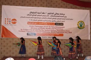 وفي الاحتفال الذي تخلله فقرات فنية قدمتها عدد من الزهرات وفقرات للفلكلور الشعبي عبرت عن هذه المناسبة، كما تم استعراض عدد من المؤشرات السكانية وتطورها والوضع الحالي للسكان والآثار السلبية جراء التزايد السكاني على القطاعات المختلفة خاصة التعليم والصحة والتركيب السكاني ومؤشر الصحة الإنجابية وتنظيم الأسرة ووضع كل ذلك في السياسة الوطنية للسكان.