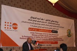 ، بمناسبة اليوم العالمي للسكان ( 11 يوليو) تحت شعار ” صحة وتنظيم الأسرة حق لكل أسرة” ، وبحضور وزير الخارجية المهندس هشام شرف ، وأمين عام المجلس الوطني للسكان الدكتور أحمد بورجي ، والممثل المقيم للأمم المتحدة منسقة الشؤون الإنسانية في اليمن “ليز غراندي” ، وممثل الصحة العالمية في اليمن ، عاكف عفيف ، ووكلاء عدد من الوزارات .