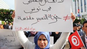 من احتجاج أمس بالعاصمة التونسية الذي ندد بقمع وسجن ناشطين وناشطات بالسعودية (الأوروبية)