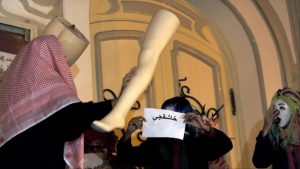 قدم مهرجون عرضا ساخرا أمام المسرح البلدي بتونس لإبراز بشاعة جريمة اغتيال خاشقجي (الأوروبية)