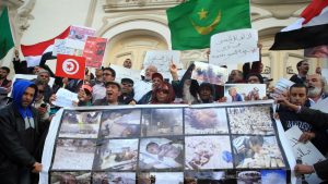 وشارك مئات المحتجين في شارع الحبيب بورقيبة بالعاصمة، مرددين شعارات ورافعين لافتات تندد بزيارة ولي العهد السعودي؛ بسبب مسؤولية الرياض في الأزمة الإنسانية في اليمن، وما تخلفه من المآسي والضحايا، وأيضا بسبب جريمة اغتيال الصحفي السعودي جمال خاشقجي الشهر الماضي في قنصلية بلاده بإسطنبول.