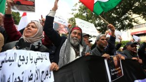 إلى جانب مأساة اليمن وجريمة خاشقجي، رفع المحتجون لافتة تدين سياسة السعودية تجاه القضية الفلسطينية (الجزيرة)