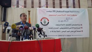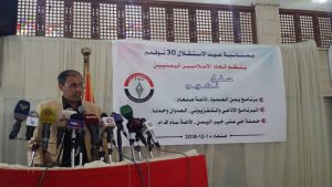 وأشار رئيس الاتحاد إلى تزامن الحفل مع ذكرى عيد الاستقلال الـ51 بقوله : اليوم يحتفل الاتحاد في ذكرى الاستقلال وإننا نؤكد هنا أن معركة الاستقلال اليوم هي في مواجهة العدوان السعودي الأمريكي، فالشكر والتقدير لأبطال الاستقلال الذي أعادوا للأمة مجدها واستقلالها والرحمة والخلود للشهداء الذين بذلوا دماءهم الزكية في سبيل الحرية والاستقلال.. لافتا إلى تزامن الحفل مع الحملة الاعلامية العدوانية التي يشنها العدوان ضد الإعلام الوطني حين أقدم على حجب قناة المسيرة.