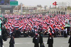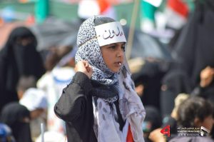 ورفع المشاركون في المظاهرات العلم اليمني ولافتات تعبر عن استمرار الصمود والثبات والتحدي في مواجهة العدوان، الذي دخل عامه الخامس.