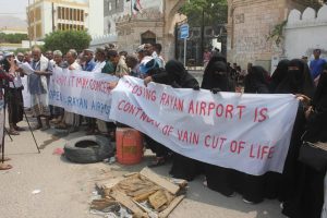 وفي الوقفة التي نُفذت امام ديوان محافظة حضرموت بالقرب من مستشفى الامومة والطفولة ( باشراحيل ) بمدينة المكلا ، رفع المحتجون لافتات كتبت باللغتين العربية والانجليزية ، دعت إلى فتح مطار الريان باعتباره شريان للحياة .