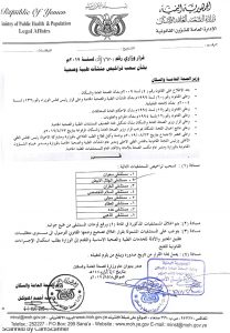وأوصدر وزيرالصحة العامة والسكان قرارا بسحب تراخيص مستشفيات سعوان، الهلال الأبيض، الخزان ، السلام التخصصي ، مجلي، العظام، حدة والذهبي، حتى يتم تصحيح وضعها القانوني للوصول إلى مستوى متطلبات تطبيق المعايير والأدلة للخدمات الطبية والصحية الأساسية