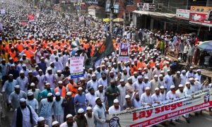 وقال شهيد الكبير، أحد المنظمين للحشد، إن أكثر من 50 ألف شخص انضموا إلى المسيرة، التي تم توقيفها بعد بضعة كيلومترات، بحسب أحد مسؤولي الشرطة.