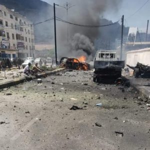 ووفقاً لمصادر محلية، انفجرت سيارة مفخخة في لحظات مرور موكبيهما في حي حجيف بمديرية التواهي.