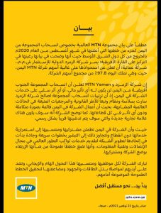 وكانت مجموعة MTN العالمية قد أعلنت مؤخرا عن انسحابها من اليمن كجزء من خطتها التي اعلنتها في شهر أغسطس من العام 2020م الخروج من كل دول الشرق الأوسط والتركيز على القارة الأفريقية